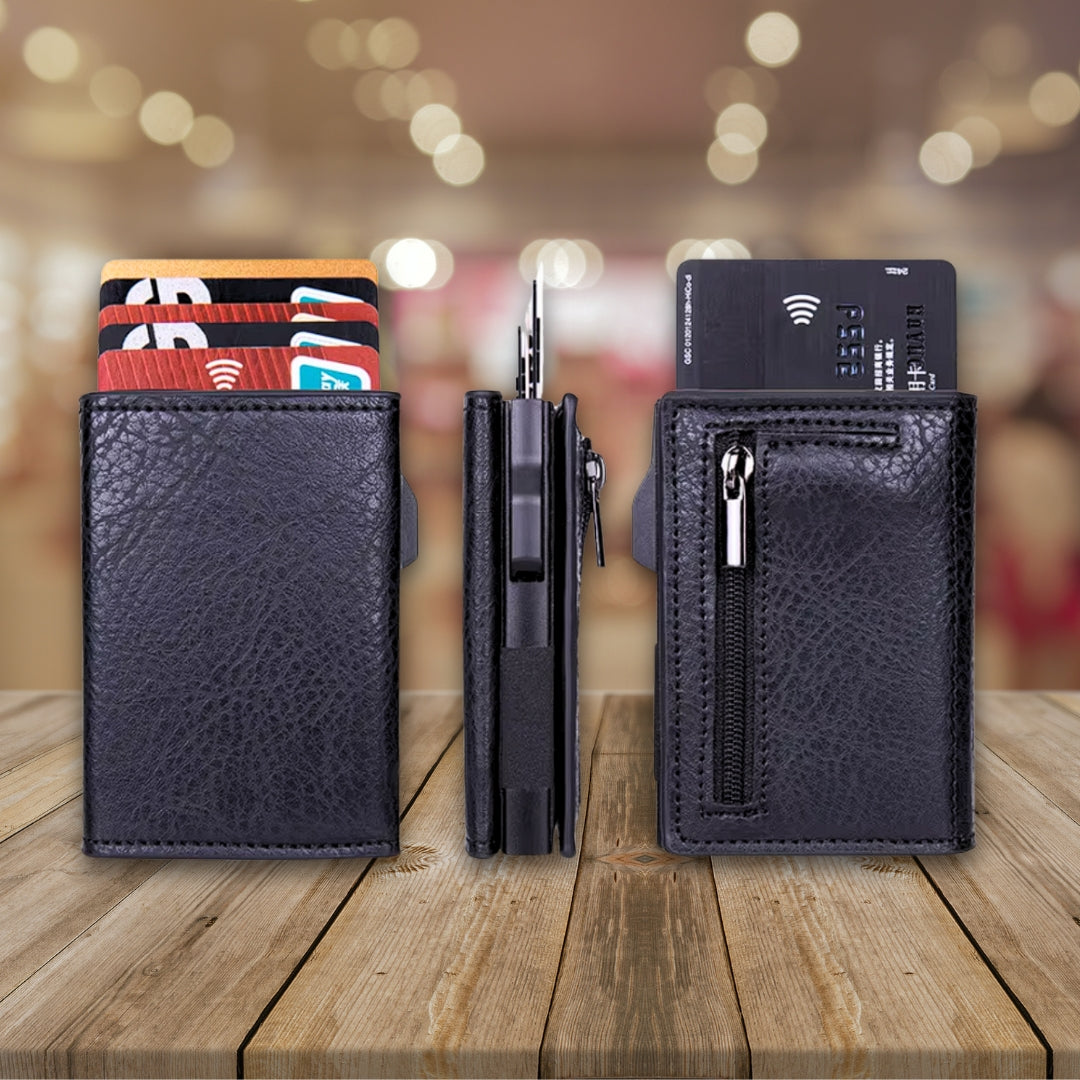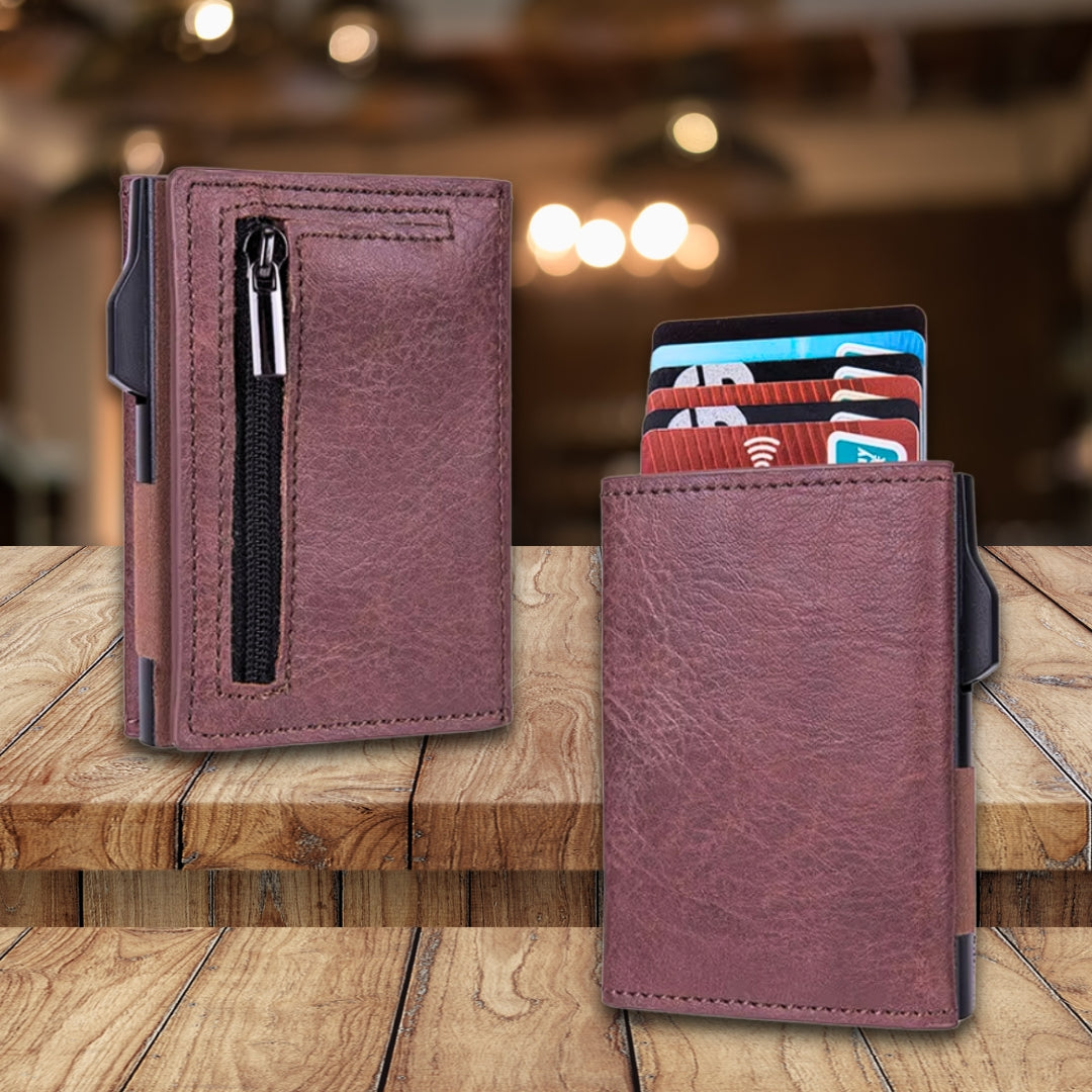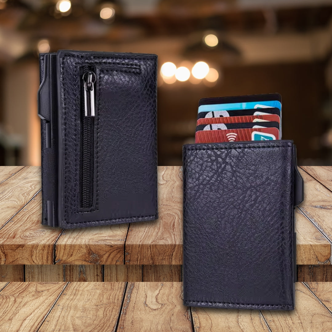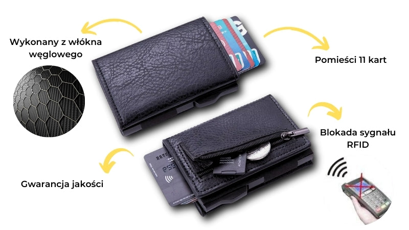 Dzięki przemyślnej konstrukcji w łatwy sposób daje dostęp do wszystkich kart oraz gotówki, przez co chroni przed zawieruszeniem kart płatniczych i dokumentów.